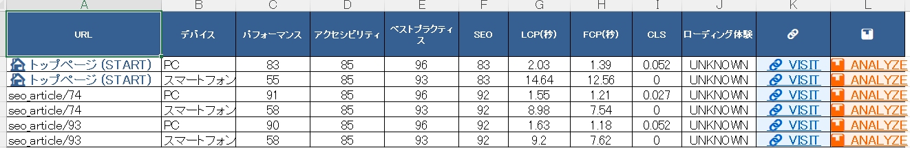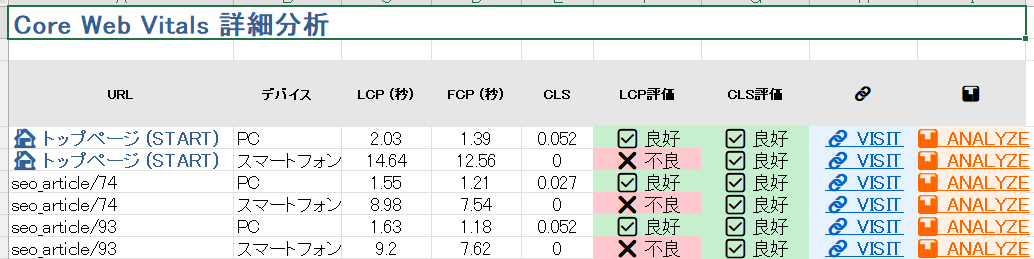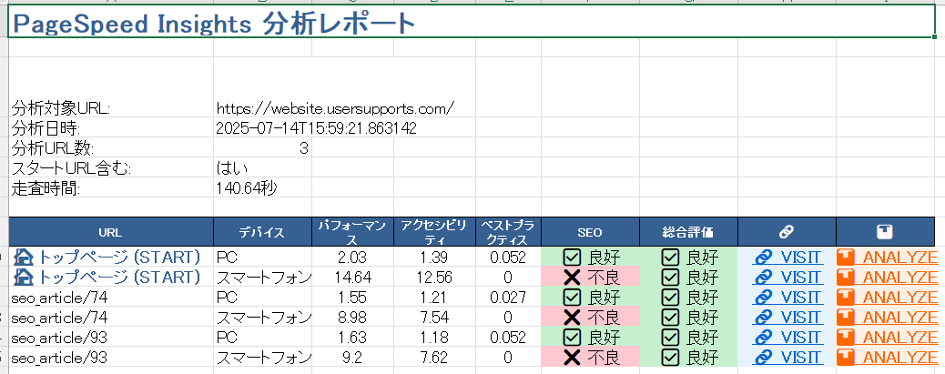 WEBサイトにアクセスしたときの返り、つまり表示スピードは、検索エンジンの評価にも影響あると考えられてきましたが、Googleの考え方や姿勢も様変わり、現状はそれに対するコメントも少なくなっているように思えます。それでも、WEBサイトの運営において常に改善監視対象であることに変わりはなく、他のチェックすべき要因とともに、Googleが提供してくれている PageSpeedInsights を利用して、状況を知り対策を練るべきです。直接、PageSpeedInsightsにアクセスし、調べればいい事ですが、このツールはそれを少しだけ現実的に便利にしました。表示時間・パフォーマンス・ユーザー補助・ベストプラクティス(最も良い選択肢)・SEOの監査値を、対象URLを基に、最大2階層・最大3ページ・デスクトップ、モバイル(携帯)まとめて取得し、管理運営し易いように、ExcelファイルとJsonファイルで取得できます。